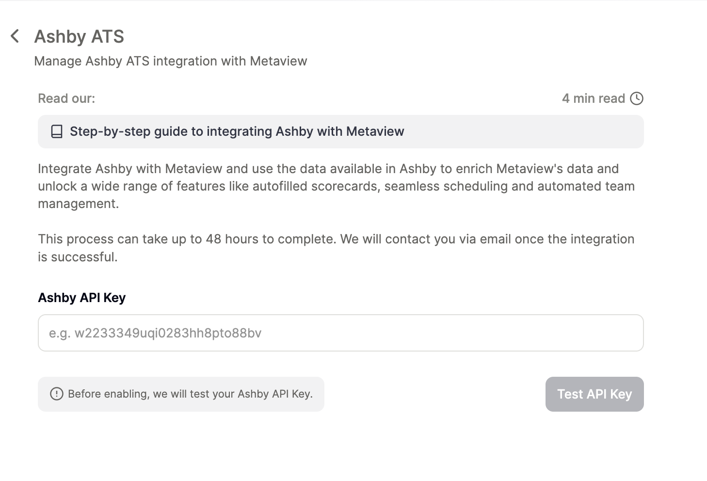 - Navigate to Integration Setting page on your Metaview acccount and select Ashby https://my.metaview.app/settings/ashby. If you haven’t previously signed up for a Metaview account, you will be prompted to go through our onboarding flow.