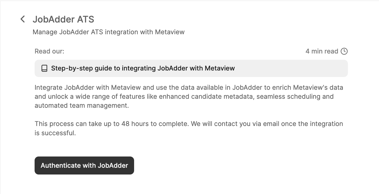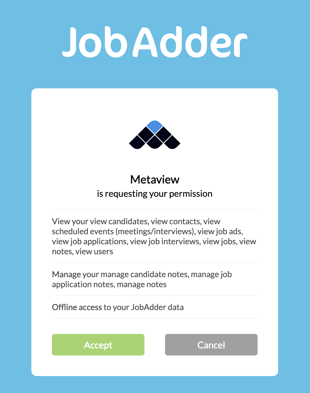 1. Start OAuth authentication Navigate to https://my.metaview.app/settings/jobadderAuthenticate with JobAdder. You will be taken to JobAdder, and asked to sign in. Metaview lists a set of permissions it needs to allow the full functionality of the Metaview - JobAdder integration. Log in and click Accept