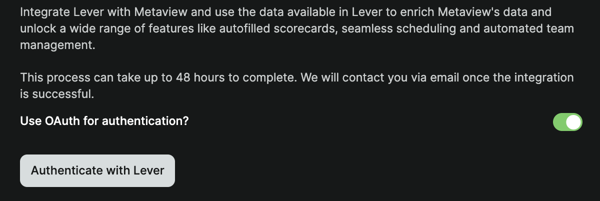 Navigate to https://my.metaview.app/settings/lever. If you haven’t previously signed in to Metaview you will be prompted to do so.