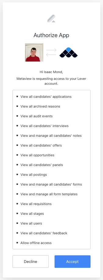 Authenticate with Lever. You will be taken to Lever. After signing in, you will be presented with an authorization confirmation question. Click Accept to continue and approve the integration.