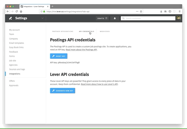 1. Settings > Integrations > API Credentials Go tothe API Credentialstab of Lever’s integrations settings page. You can do this by either using this link, or by following the steps in the GIF below.