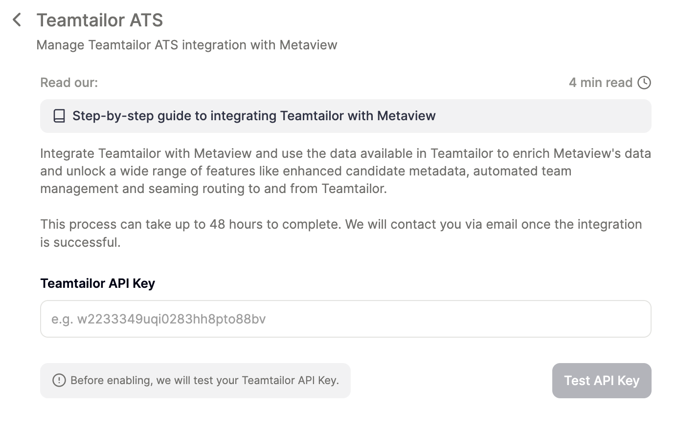 Navigate to https://my.metaview.app/settings/teamtailor. If you haven’t previously signed in to Metaview, you will be prompted to do so. Enter the API key into the corresponding field.