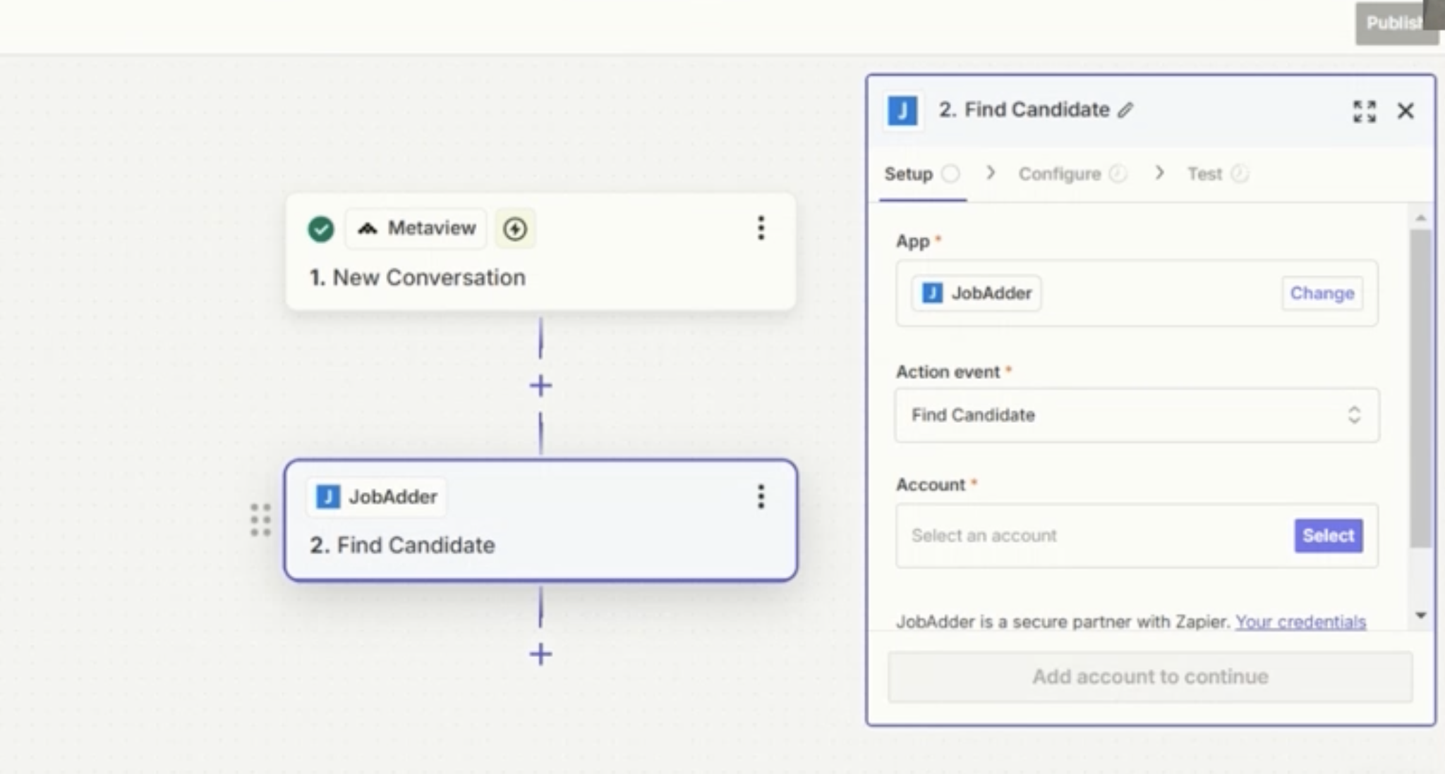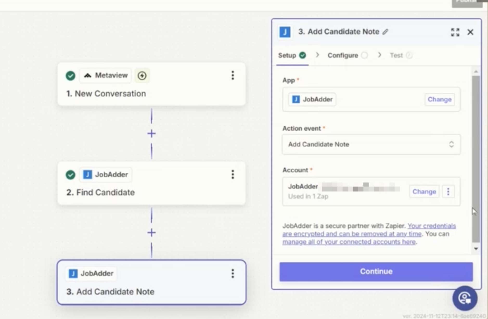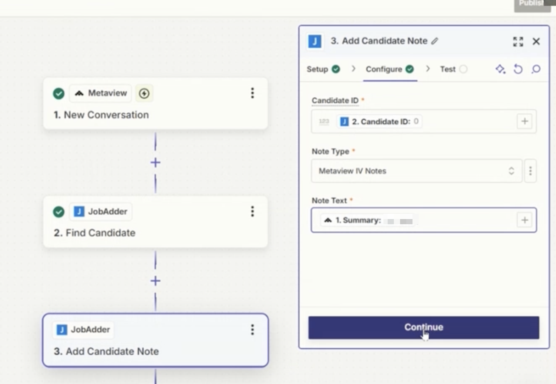 With this setup, every completed Metaview conversation will automatically be added as a note to the candidate’s profile in JobAdder, centralizing your notes. If you need assistance, contact our support team at support@metaview.ai.