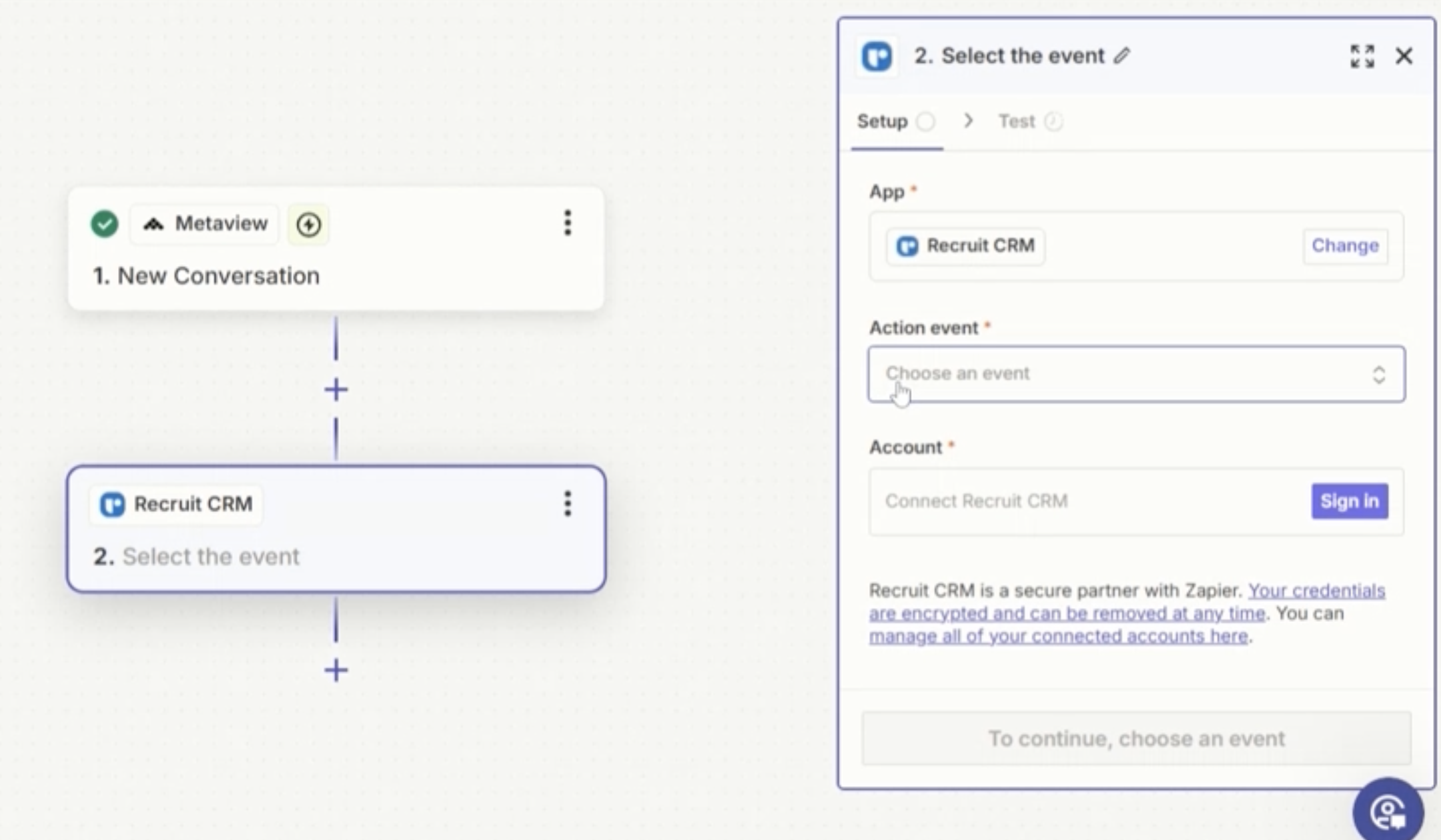 - Add an Action in Zapier and select Recruit CRM as the app.