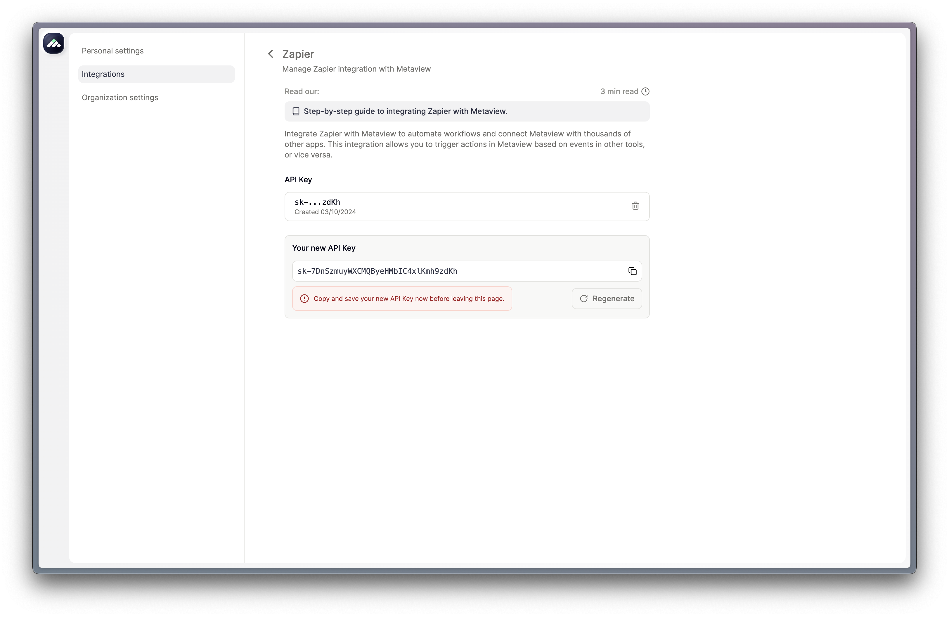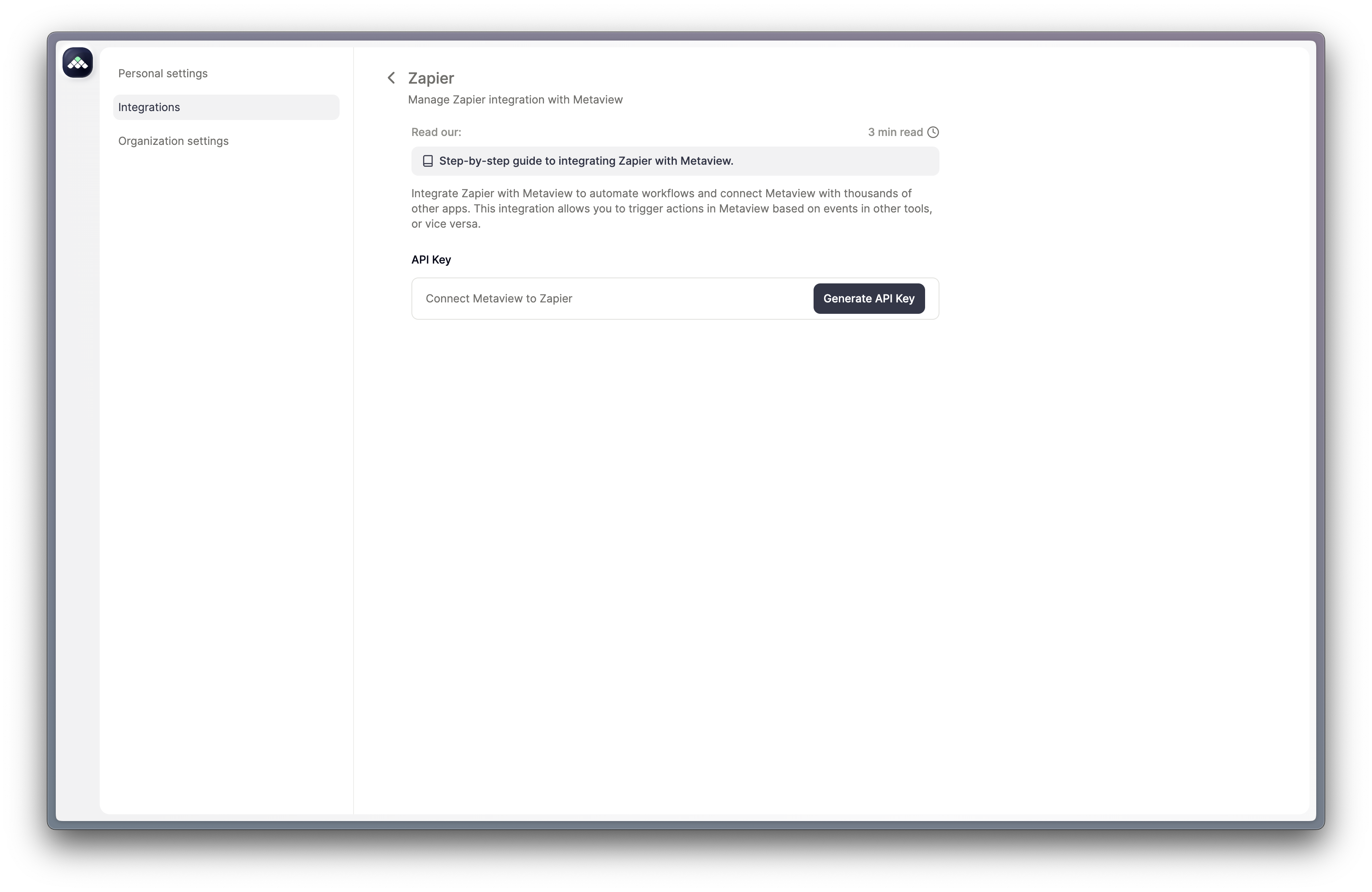 1. Create a Zapier account If you don’t have an account already, sign up at https://zapier.com. Creating an account is free and you can get started immediately. 2. Navigate to the Zapier integration settings in the Metaview app You can navigate to the Zapier settings directly with this link, or navigate through the Integrations page.What is Zapier?