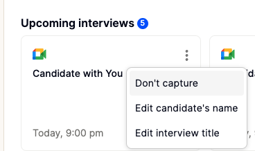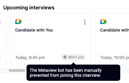 You can manually disable Metaview for a previously scheduled call in advance. Go toyourMetaview home page, select the call under My Conversations: Upcoming Conversations, click on ⋮ (3 dots) and the Don't capture option. Admins can also manually disable on behalf of others on their team under the All Conversations tab.