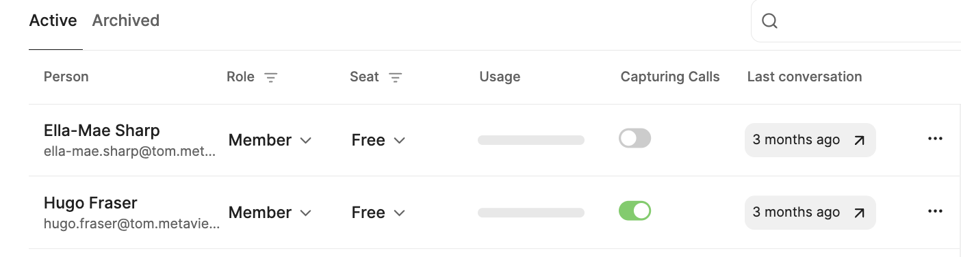 You can disable Metaview from automatically scheduled events, including those picked up from your Calendar or ATS. This way, Metaview will only schedule your upcoming video conference calls if they were manually scheduled. See Manual invites for details. You can manage your status on the Team Management page of your account. Find your profile and change the Capturing Callstoggle. When the toggle is enabled Metaview will automatically schedule video conference calls. When the toggle is disabled, Metaview will only schedule calls that have been invited using Manual invites.