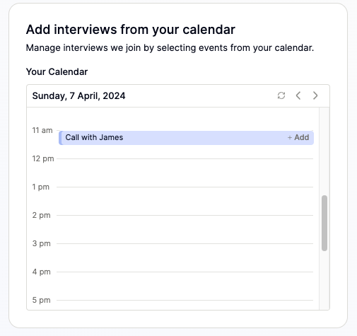 Once you have connected your Google Calendar or Outlook Calendar, you will see your calendar on your Metaview home page. Simply clickAdd on the event to invite Metaview.