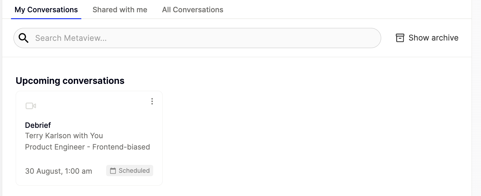 How do I check if Metaview is expected to join my upcoming video conference call? The best place to check to see if Metaview is expected to join an upcoming call is to look at your Upcoming conversations section on your Metaview home page. Metaview is not scheduled to join your video conference call if it’s not there or if it has the “won’t join” tag.When Metaview is automatically scheduled by your ATS, Calendly or calendar, the