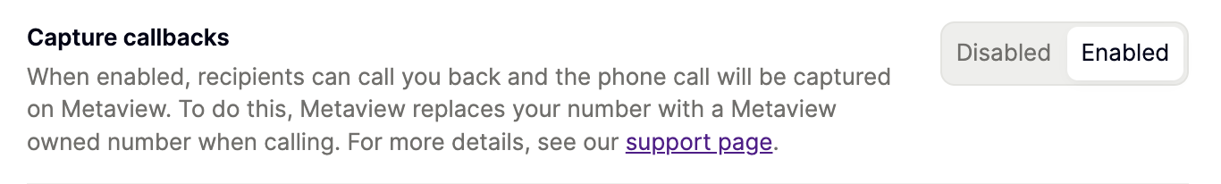 - If you call an international number or use an extension within Metaview, we will turn off this Capture Callbacks feature for that phone call.