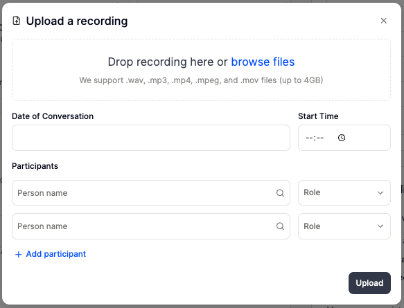 - Please note that the normal Access rules still apply, so only call participants listed as interviewers and admins will have access by default to the transcript and notes. Therefore, even if you are the one uploading the recording, if you do not include yourself as a participant with the role of Interviewer, once the conversation is uploaded and processed, it will not show up in your conversations.
