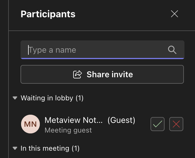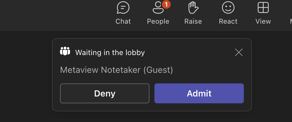 If your Teams settings require meeting hosts to admit guests, the Notetaker will need to wait in the Teams “lobby” and will send this request notification to the meeting host. Metaview will not capture any notes for you until it has been admitted into the meeting.Ending your call