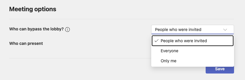 To change your Teams settings, select an upcoming calendar event go to your Meeting Options. Please find the following instructions from Microsoft. One of the options you might be able to change is who can bypass the lobby. IfPeople who were invited or Only me are selected, the Metaview Notetaker bot will need to be admitted by the meeting host.