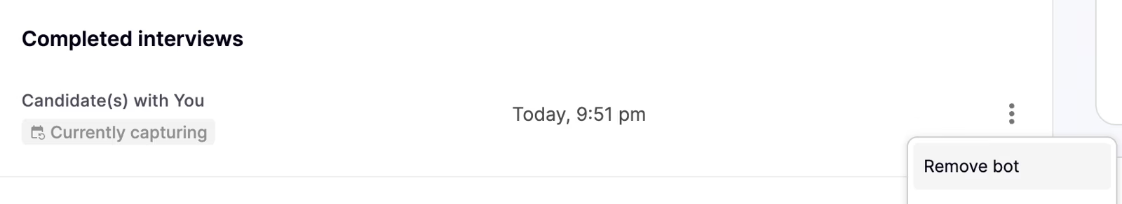 ⋮ (3 dots) of the ongoing call and select the Remove bot option. If you remove the bot at the start of the call then Metaview will not process the notes. Click Confirm and the bot will leave the Teams call within 30 seconds.