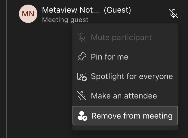 Call participants can easily remove Notetaker bot from an ongoing Teams call. Meeting hosts can remove the bot directly from the meeting screen. Selectthe bot, click ... (3 dots) and Remove from meeting. If you remove the bot at the very start of the call, Metaview will not process any notes.