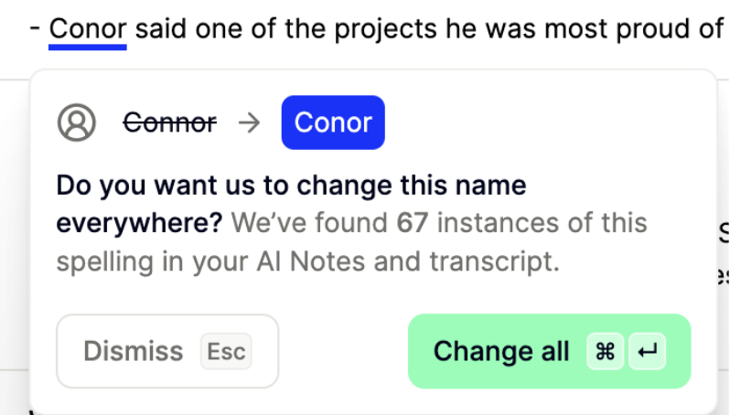 Metaview AI-generated notes are fully editable and allow you to edit, delete, correct, supplement, and personalize the final output based on your observations, priorities, and judgment. Edit the notes directly in the notes editor in your browser window, and they will be saved automatically. Metaview may sometimes mistranscribe certain words, especially proper nouns. If you correct the spelling of these words in your notes Metaview will prompt you to also update all other similar words found in the transcript and notes. ClickChange all to fix all occurrences, or Dismiss to not apply any additional corrections.